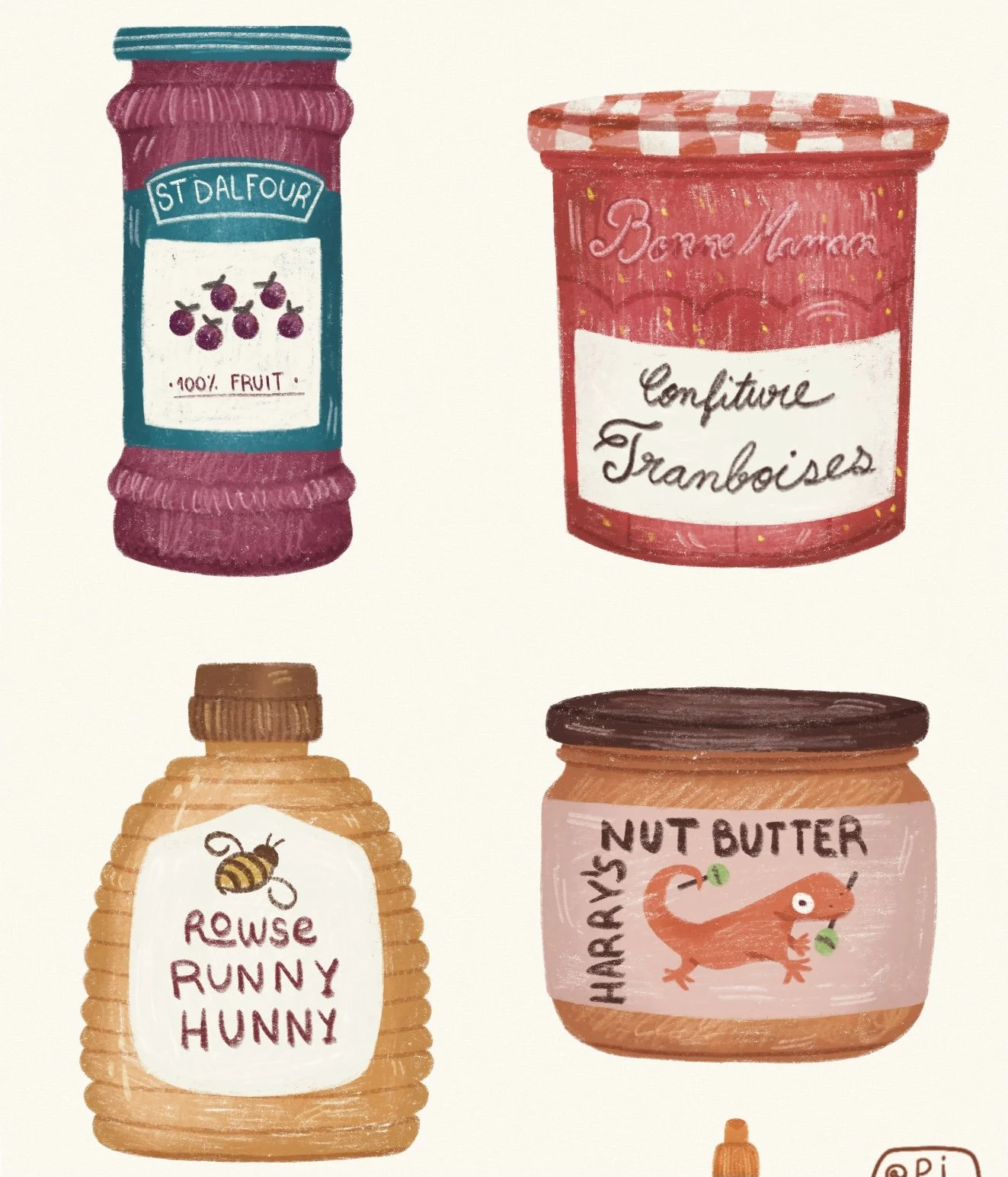 This is an illustration of pots of jams, sauces and butters that I had in my kitchen.